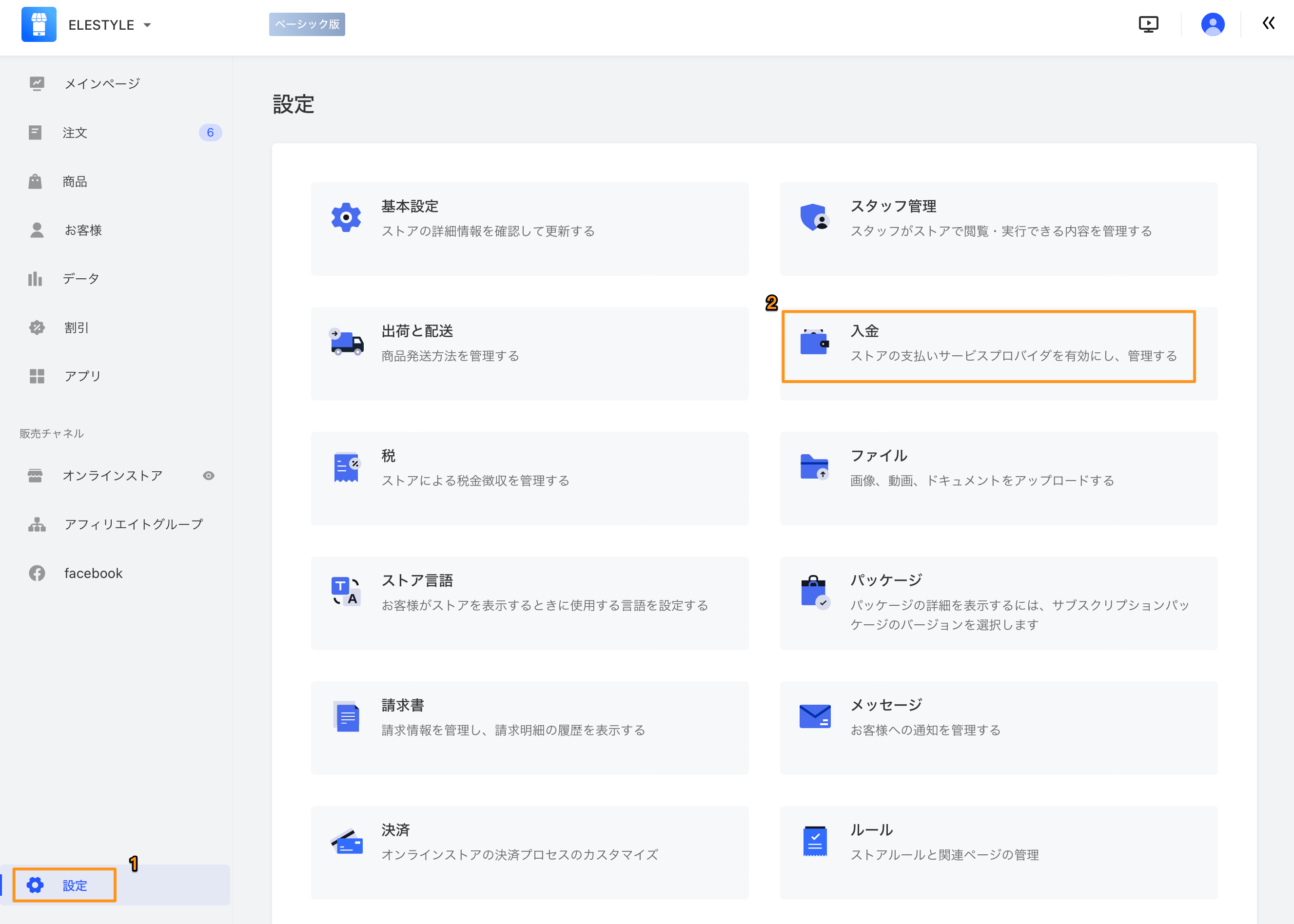 - AllValue の管理画面にログインして、「設定」→「入金」をクリックしてください。