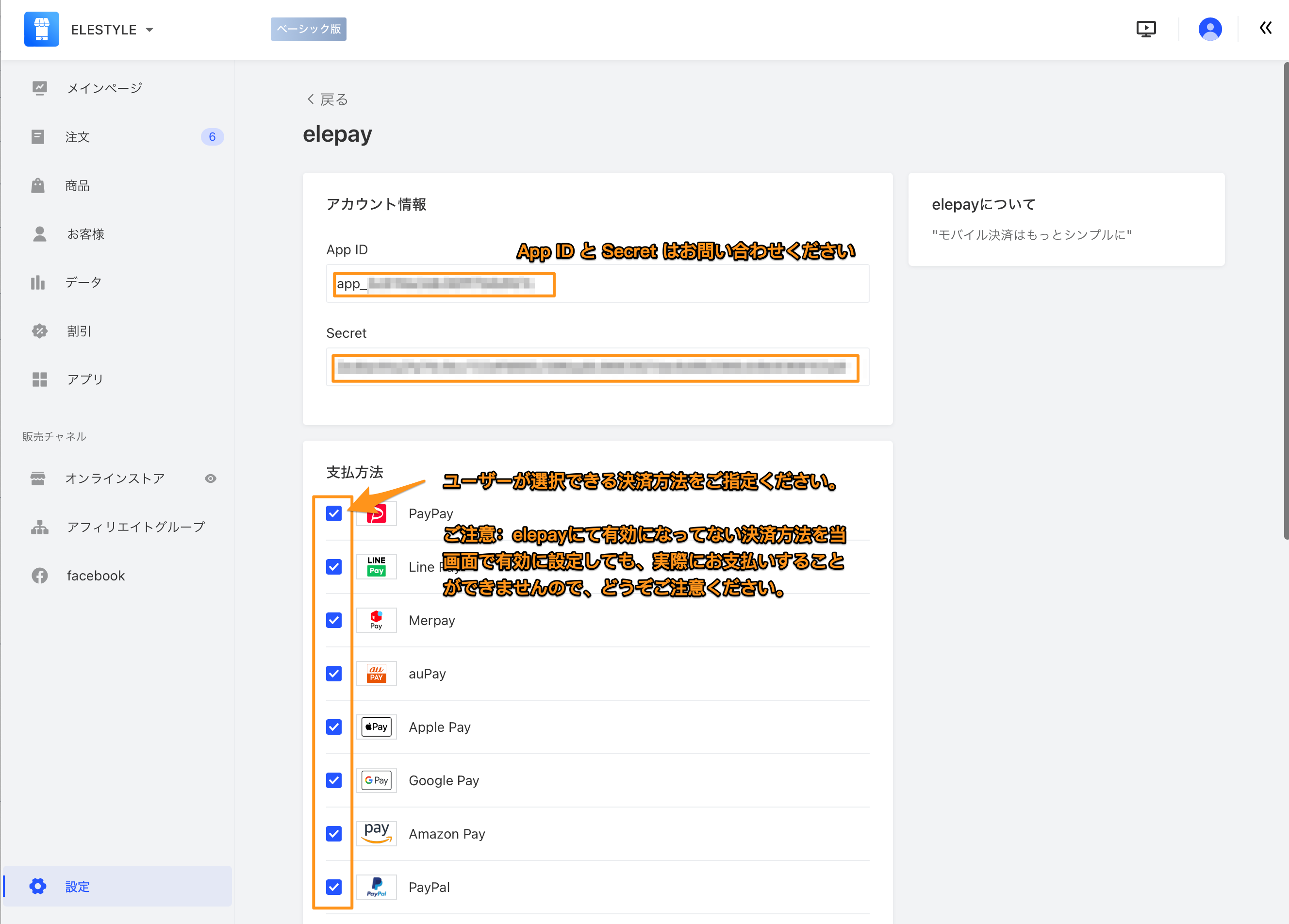 - elepay の設定画面に、App ID と Secret をご入力ください(設定値は elepay サポートデスクまでお問い合わせください)。