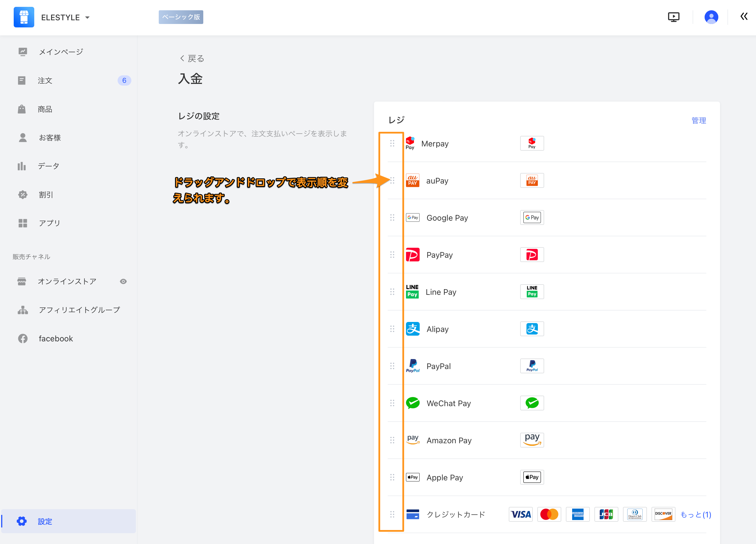 - 入金画面に戻りましたら、「レジの設定」にて決済方法の表示順を調整することができます。