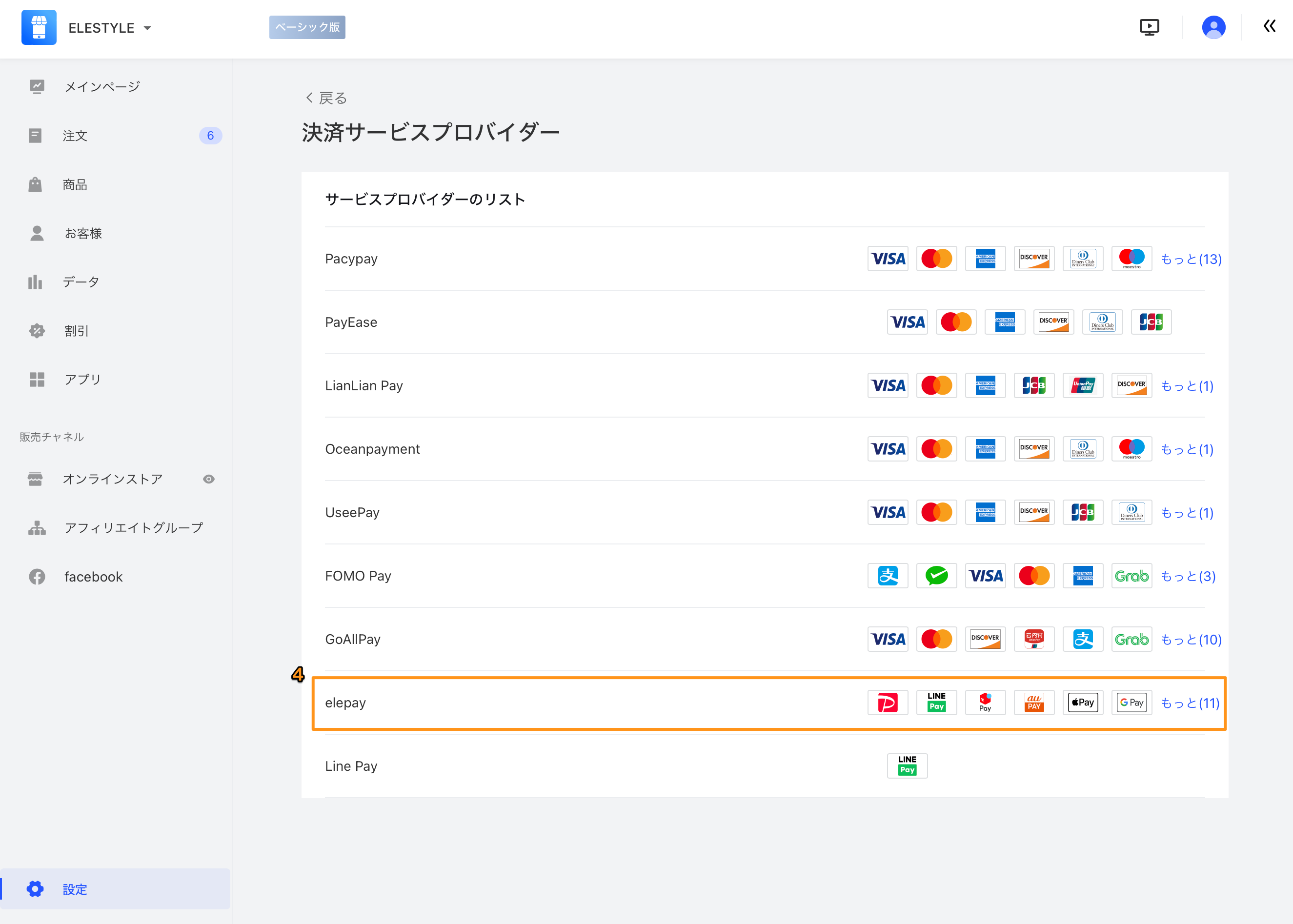- 決済サービスプロバイダー一覧から、「elepay」をクリックしてください。