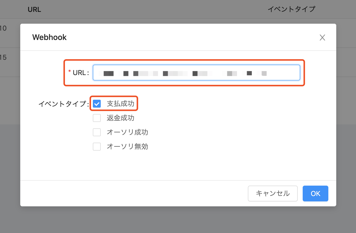 - STEP 3 にてコピーしたWebhookリンクを「URL」にペーストして、下の「イベントタイプ」にある「支払成功」をチェックしてから、「OK」をクリックしてください。