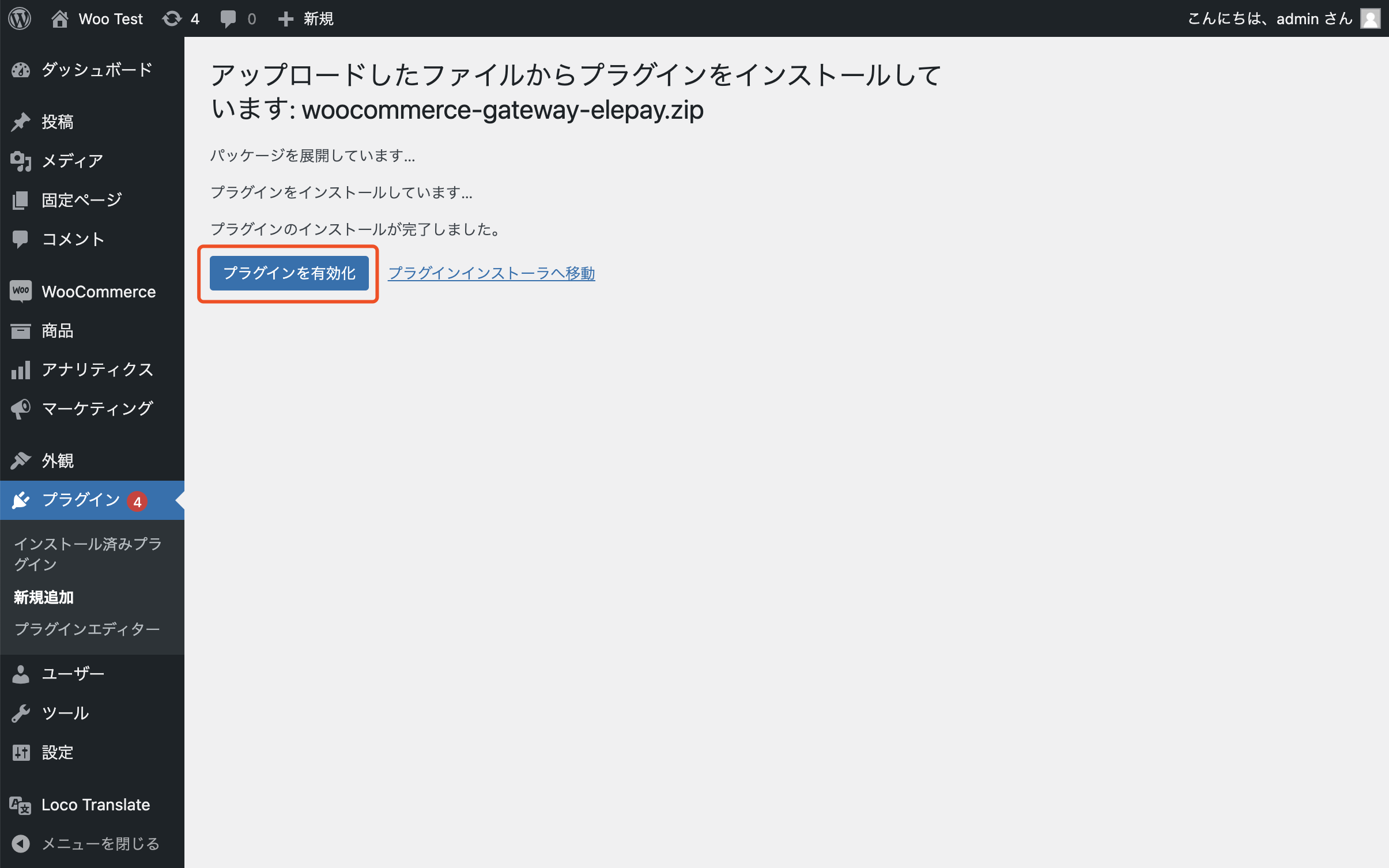 - インストール結果画面にて「プラグインを有効化」ボタンをクリックしてください。