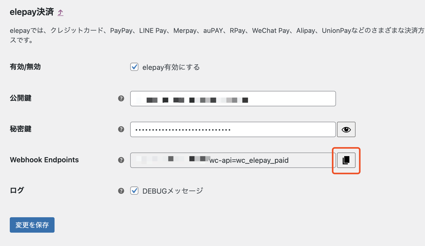 「有効/無効」にて、「elepay有効にする」をチェックして、「公開鍵」と「秘密鍵」に、elepay管理画面から取得した開発キーを入力してください。最後に「変更を保存」ボタンをクリックしてください。