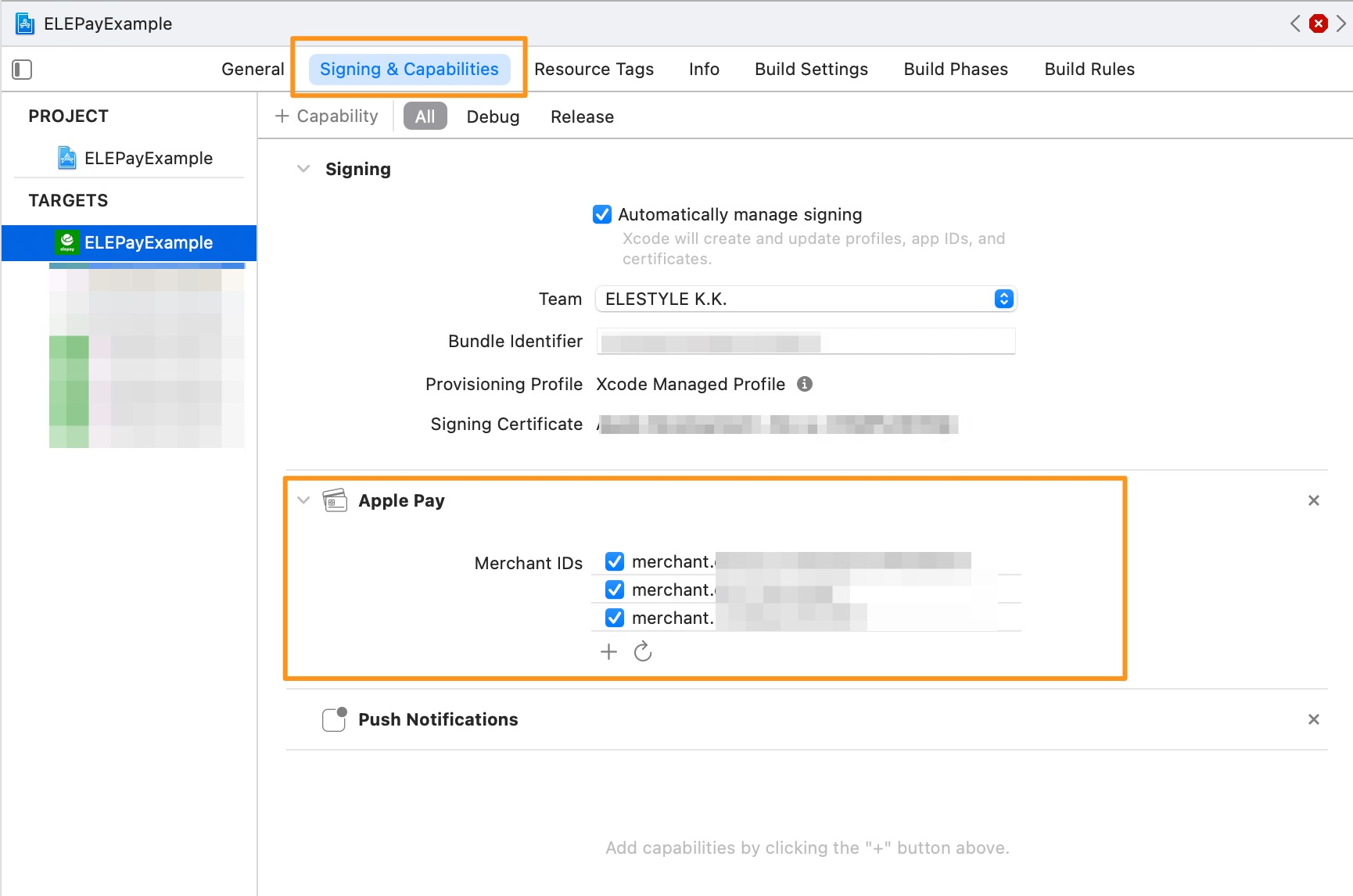 Xcode の設定に、Apple Pay が有効している事を確認の上、Apple Pay 証明書 を elepay 管理画面へアップロードしたことを確認してください。