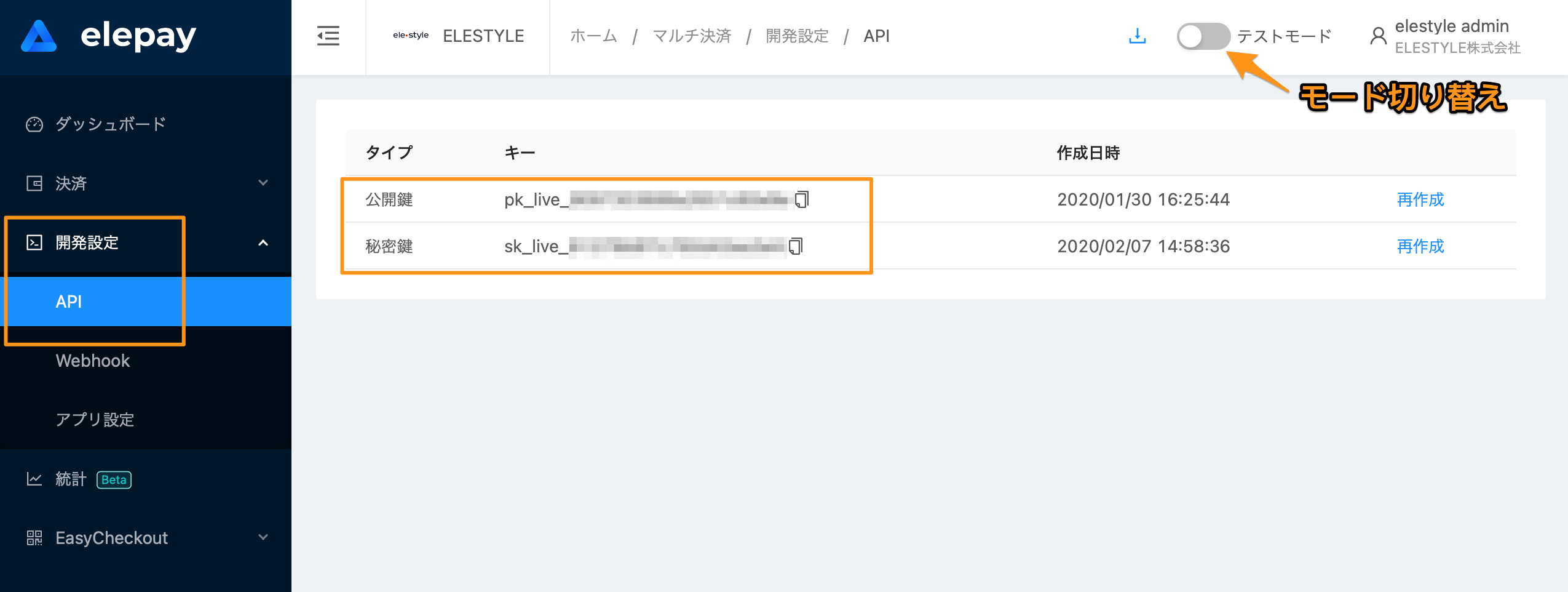 App keys for the Test and Live environments are managed in the elepay dashboard. Click “開発設定 / API” in the left navigation to view your API keys.