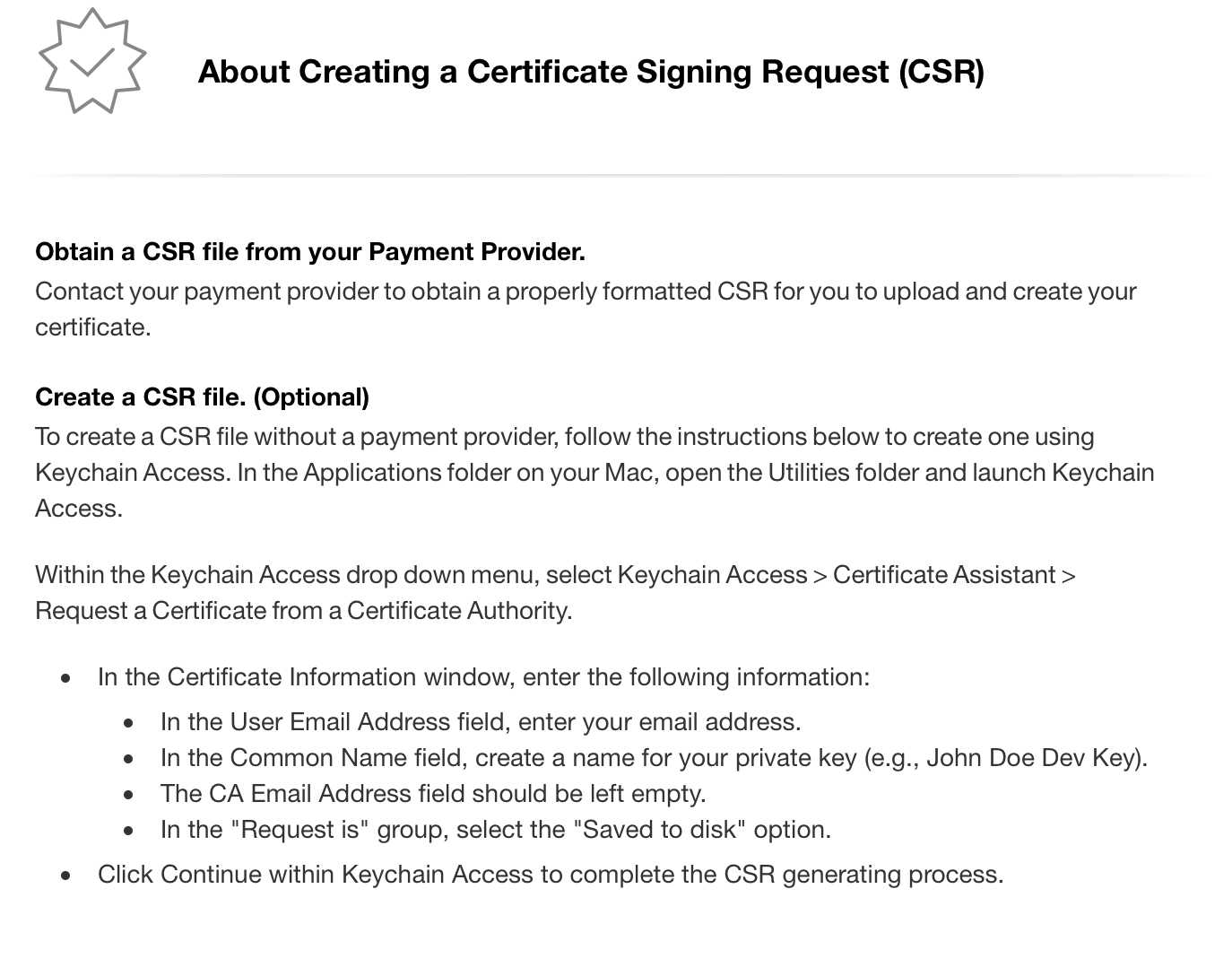 • Apple Developer  から、Certificate Signing Request (CSR)ファイルを作成してください。以下のガイドを参考してください。