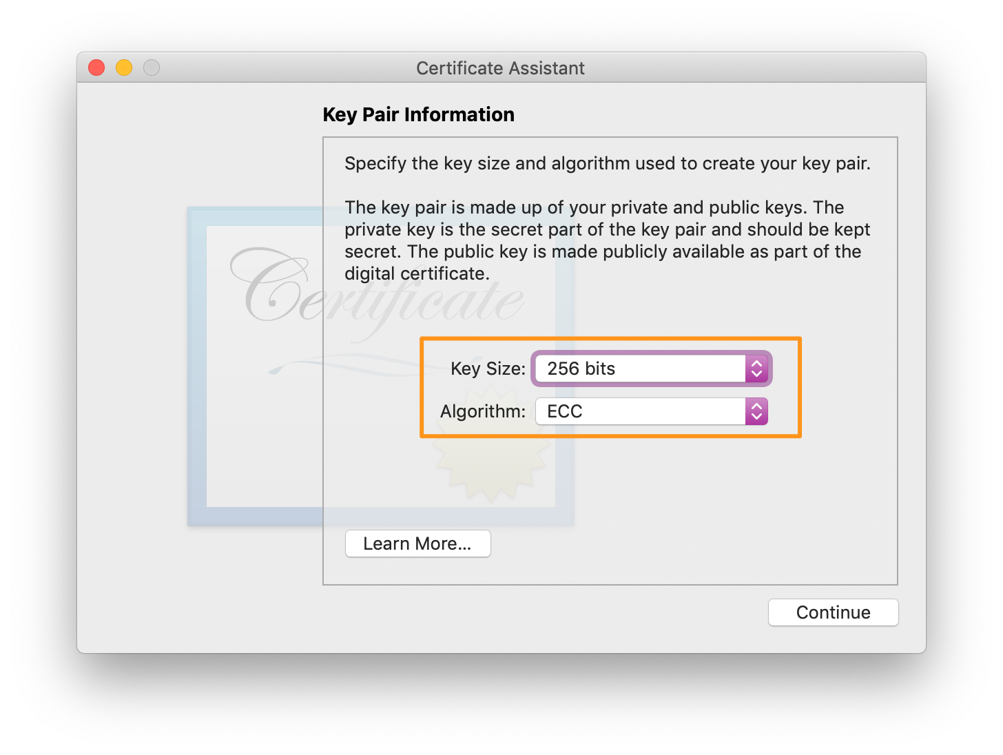• 「Key Pair Information」画面で、Algorithm を「ECC」に指定し、Key Size を「256 bits」に指定してください。