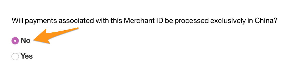 • 作成した CSR ファイルを developer.apple.com にアップロードする時、 「Will payments associated with this Merchant ID be processed exclusively in China?」を「No」を選択してください。